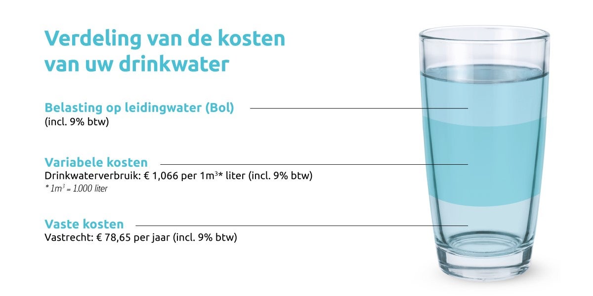 Naast de vaste kosten betaalt u ook kosten voor uw verbruik, de variabele kosten: in 2023 is de prijs per 1.000 liter € 1,066 (incl. 9% btw). De watermeter houdt bij hoeveel water u verbruikt. Hoe minder drinkwater u verbruikt, des te lager de kosten voor het verbruik. Door bewust om te gaan met drinkwater, draagt u bij aan het milieu en dat ziet u terug op uw drinkwaterrekening. Handige tips om drinkwater te besparen vindt u hier.